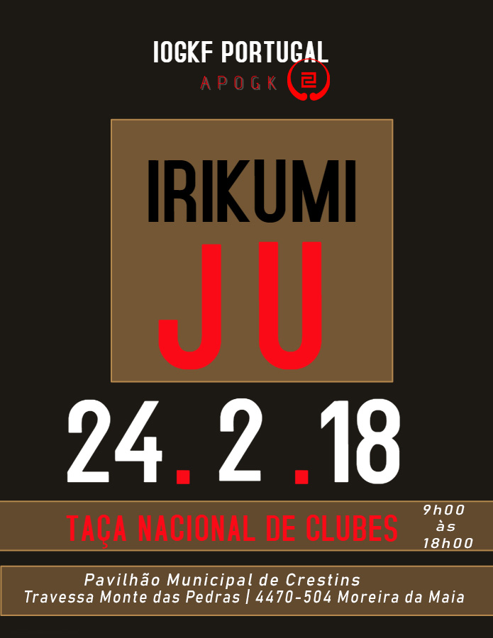 Taça Nacional de Clubes_24 fevereiro_Crestins IOGKF Portugal (APOGK) 18/02/2018 No comments No dia 24 de fevereiro vai realizar-se a TAÇA NACIONAL DE CLUBES – IRIKUMI JU no Pavilhão Municipal de Crestins entre as 9h e às 18h. Contamos com a sua presença!
